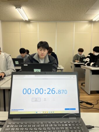 一本指でゆーーーーーーっくり文字を打つ学生やキーボードばかり見ている学生が多いので、ここで矯正するために制限時間を設けて決まった文章を打ち終えるよう努力しています!
